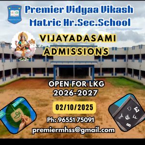 Premier Vidyaa Vikash Matriculation School, the off shoot of Vidyaa Educational trust unfolded itself during the academic year 2007–2008, with classes Kinder Garten to VIII, to contribute its bit to hone young skills for a better India. Our school crossed another milestone with the starting of the Nine and Ten Grades during the academic year 2008-2009 and then the Higher Secondary course, during the academic year 2009-2010.